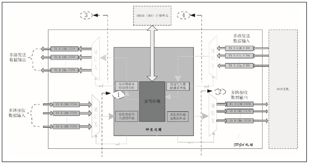 (1)發(fā)送處理部分:邏輯接收HOST主機的數(shù)據(jù),然后根據(jù)仲裁邏輯的優(yōu)先級策略分通道寫入SDRAM (DDR)中進行緩存(寫操作),在發(fā)送的下游數(shù)據(jù)接口,仲裁邏輯再從SDRMA(DDR)中讀取數(shù)據(jù)發(fā)送到相應(yīng)的通道出口中去