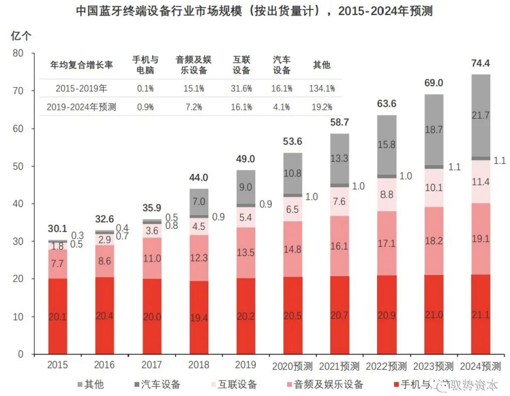 2015年至2020年期間中國藍(lán)牙終端設(shè)備出貨量穩(wěn)步提升,未來伴隨藍(lán)牙芯片在各領(lǐng)域滲透率持續(xù)提升,預(yù)計至2024年藍(lán)牙終端設(shè)備出貨量將達(dá)74.4億個。