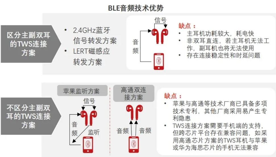 藍(lán)牙芯片的重要應(yīng)用場景。早期藍(lán)牙標(biāo)準(zhǔn)不支持無線多路直連,無法實(shí)現(xiàn)雙耳同步傳輸,普通藍(lán)牙耳機(jī)僅能實(shí)現(xiàn)一對一連接,蘋果采用Snoop監(jiān)聽模式,在一只耳機(jī)進(jìn)行藍(lán)牙音頻傳輸時(shí),另一只耳機(jī)利用它們之間的私有協(xié)議對其進(jìn)行監(jiān)聽,達(dá)到1對2連接的目的。由于蘋果對監(jiān)聽模式進(jìn)行專利封鎖,早期安卓TWS廠商主要采用relay轉(zhuǎn)發(fā)模式,將音頻從手機(jī)傳至左耳設(shè)備,再由左耳轉(zhuǎn)發(fā)至右耳,但該方案存在諸多劣勢,例如(1)音頻傳輸過程較長造成連接不穩(wěn)定;(2)延遲問題嚴(yán)重;(3)接受音頻傳輸?shù)闹饔枚鷻C(jī)的電池功耗顯著高于輔用耳機(jī)。安卓TWS廠商受限于技術(shù)實(shí)力,TWS耳機(jī)產(chǎn)品音頻傳輸體驗(yàn)亟待提升。