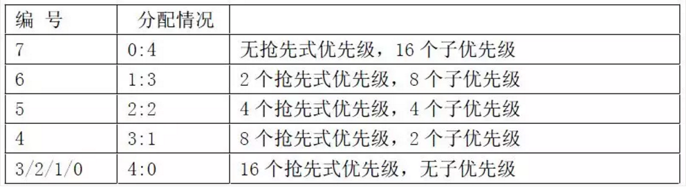 20、(NestedVectored Interrupt Controller)NVIC嵌套向量中斷控制器,分為兩種:搶先式優(yōu)先級(可嵌套)和中斷優(yōu)先級(副優(yōu)先級,不能嵌套)。兩種優(yōu)先級由4位二進(jìn)制位決定。分配下來有十六種情況: