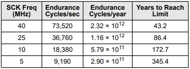 FeRAM存儲器具有讀取和還原機制。因此,對于存儲陣列的每次訪問(讀取或?qū)懭耄?,將按行施加耐久周期?FRAM體系結(jié)構(gòu)基于每個64位的16K行的行和列的陣列。整個行在內(nèi)部訪問一次,無論是讀取還是寫入一個字節(jié)或全部八個字節(jié)。在耐久性計算中,該行中的每個字節(jié)僅被計數(shù)一次。下圖顯示了一個64字節(jié)重復(fù)循環(huán)的耐久性計算,該循環(huán)包括一個操作碼,一個起始地址和一個順序的64字節(jié)數(shù)據(jù)流。這將導(dǎo)致每個字節(jié)在整個循環(huán)中經(jīng)歷一個持久周期。即使在40 MHz時鐘速率下,F(xiàn)RAM的讀寫持久性實際上也是無限的。