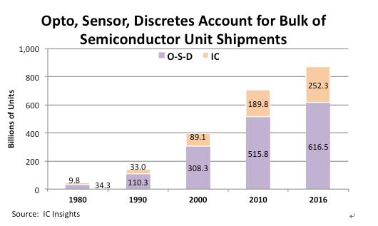 雖然集成電路技術(shù)不斷發(fā)展,越來越多的功能被集成到一顆存儲芯片中,從而以系統(tǒng)的角度來看用到的芯片數(shù)量越來越少,但IC Insights的統(tǒng)計結(jié)果顯示,全球半導(dǎo)體出貨量中,集成電路占比依然很低,而光電器件、傳感器與分立器件(Opto-Sensor-Discrete,簡稱O-S-D)的比重仍然超過七成。