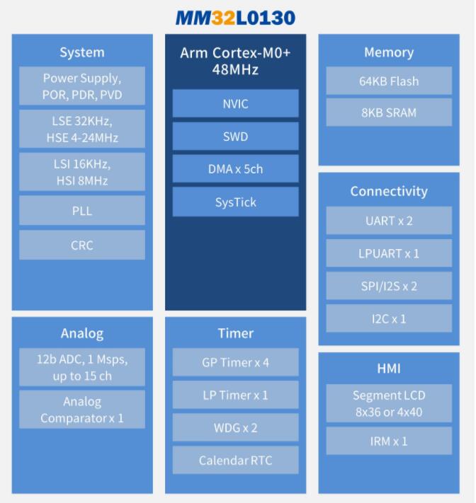 上海靈動微電子低功耗MM32L0130系列MCU產(chǎn)品搭載ArmCortex-M0+處理器,集成段碼LCD驅(qū)動,功耗可低至100nA,適用于多種低功耗應(yīng)用場景。