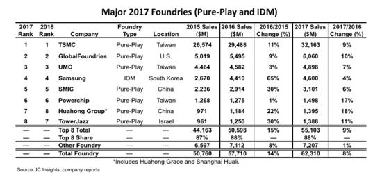 根據(jù)IC Insights最新研究報告顯示,2017年全球八大晶圓廠商銷售額總計達551.03億美元,同比增長9%,比2016年的15%增速有所放緩。這8家廠商2017年的市場份額達到88%,市占率與2016年相同。