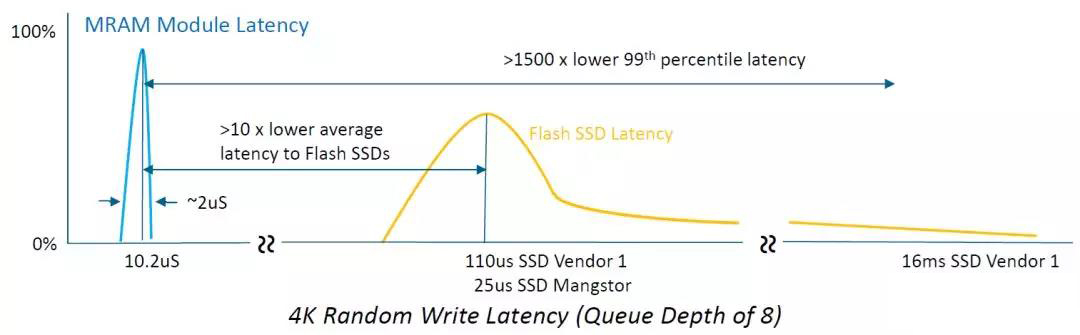 Everspin科技公司目前是全球第一家提供MRAM存儲(chǔ)芯片產(chǎn)品,目前推出最新款的產(chǎn)品STT-MRAM產(chǎn)品,單顆芯片容量可達(dá)32MB,可以做SSD固態(tài)硬盤的緩存綽綽有余,如下圖,MRAM的讀寫延遲只有10微秒左右,而且在命令很多的情況下,延遲QoS非常穩(wěn)定,波動(dòng)在2微秒之內(nèi)。而SSD的延遲在100微秒,同時(shí)命令多了之后,延遲更長。