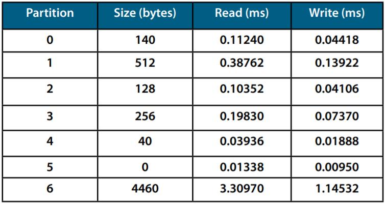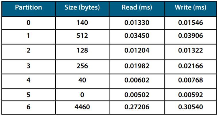 MRAM低級驅(qū)動程序通過操作系統(tǒng)和調(diào)度程序集成到動力總成應(yīng)用程序中。讀寫周期由系統(tǒng)時鐘(300MHz)測量。圖1&2顯示了針對動力總成應(yīng)用的具有不同非易失性存儲器接口的每個分區(qū)的讀/寫時間。這些表顯示大多數(shù)讀/寫周期小于2ms。毫不奇怪,該表確認35ns并行接口以比40MHz