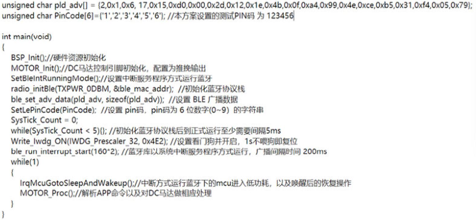 以下為主函數初始化配置內容,主要將所有的外設資源和藍牙協(xié)議棧初始化,并且以中斷服務程序的方式運行藍牙,主函數的循環(huán)中主要實現的功能為判斷是否進入低功耗模式,并且喚醒后根據接收到的藍牙數據對DC馬達進行不同的操作,代碼如下: