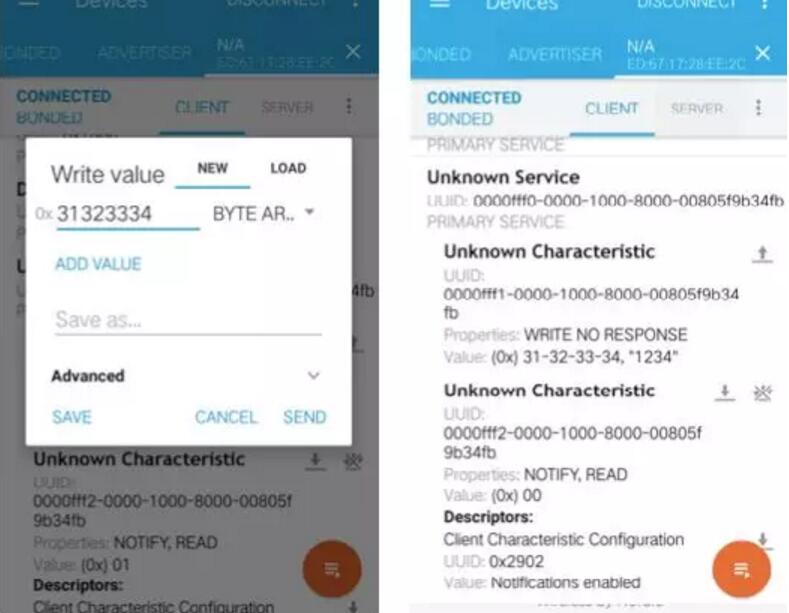 連接成功后,對UUID為fff1的特征值寫0x31323334(模擬用戶輸入密碼”1234”),測試板上連接的馬達開始轉動,執(zhí)行開鎖動作;