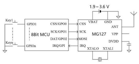 藍牙芯片MG127是具有低功耗、低成本的BLE 收發(fā)器,內部集成了發(fā)射機、接收機、GFSK 調制解調器和BLE 基帶處理。電源電壓1.9~3.6,可以采用一個紐扣電池(3.0v)供電,具備3uA待機電流,20mA@0dBm持續(xù)發(fā)射,18mA持續(xù)接收等特點。MG127 采用DFN3x3 封裝,只需搭配低成本MCU 和少數外圍被動器件,即可實現BLE 遙控、藍牙電子秤等應用。