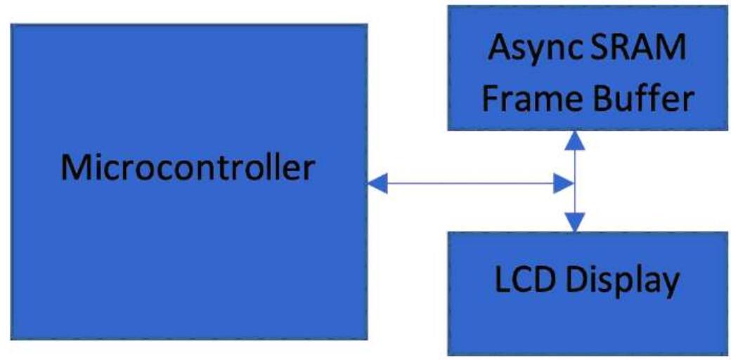 SRAM將無法提供足夠的容量或性能。為了避免畫面撕裂,也有必要采用雙緩存。在這些系統(tǒng)中通常在外部存儲器中實現(xiàn)幀緩存。在刷新周期中,從外部幀緩存讀取數(shù)據(jù),并連同控制信號輸出給顯示控制器數(shù)據(jù)總線。圖1所示的是采用外部幀緩存的典型顯示框圖。
