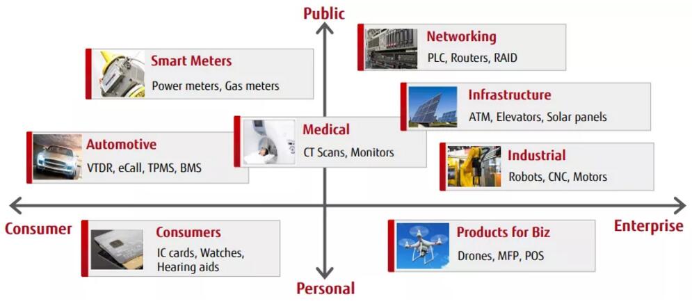 經(jīng)過市場的長期廣泛驗(yàn)證以及技術(shù)的不斷突破,富士通FRAM產(chǎn)品已成功應(yīng)用于智能卡及IC卡等卡片領(lǐng)域、電力儀表及產(chǎn)業(yè)設(shè)備等工業(yè)領(lǐng)域,醫(yī)療設(shè)備及醫(yī)療RFID標(biāo)簽等醫(yī)療領(lǐng)域、胎壓監(jiān)測及新能源汽車電池管理系統(tǒng)等汽車領(lǐng)域等等,涉及的應(yīng)用超過200種,幾乎覆蓋所有主要領(lǐng)域!