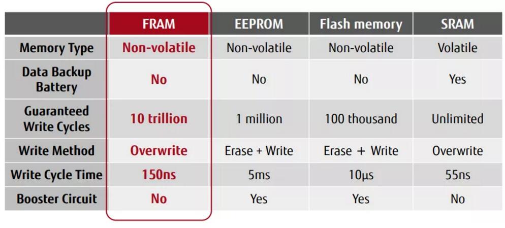 富士通FRAM主要具備三大優(yōu)勢:高讀寫入耐久性、高速寫入以及低功耗,這是絕大多數(shù)同類型存儲器無法比擬的。比如FRAM寫入次數(shù)壽命高達(dá)10萬億次,而EEPROM僅有百萬次(10^6)。富士通FRAM寫入數(shù)據(jù)可在150ns內(nèi)完成,速度約為EEPROM的1/30,000。寫入一個字節(jié)數(shù)據(jù)的功耗僅為150nJ,約為EEPROM的1/400,在電池供電應(yīng)用中具有巨大的優(yōu)勢。