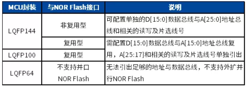 MM32F3270系列MCU因?yàn)榉庋b的原因,導(dǎo)致只有部分MCU產(chǎn)品可以通過(guò)硬件復(fù)用出全部或部分的FSMC接口的相關(guān)GPIO;外擴(kuò)NOR Flash也只有使用 LQFP144引腳封裝MCU芯片才能支持連接地址數(shù)據(jù)非復(fù)用和復(fù)用方式外擴(kuò)并行NOR Flash;而LQFP100引腳封裝芯片因地址線縮減,僅支持連接地址數(shù)據(jù)復(fù)用方式外擴(kuò)并行NOR Flash。LQFP64因?yàn)闊o(wú)法引出足夠的地址與數(shù)據(jù)總線,同樣不支持外擴(kuò)并行NOR Flash。目前市場(chǎng)上非復(fù)用型16位數(shù)據(jù)總線接口的NOR Flash也是較為普遍。