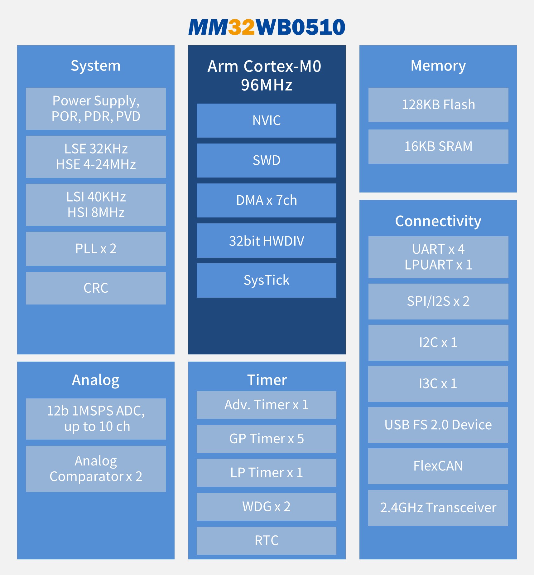 MM32WB0510搭載Arm Cortex-M0內(nèi)核,主頻可達(dá)96MHz,內(nèi)置128KB Flash和16KB SRAM,并集成了USB和FlexCAN接口,面向智能家居,鍵鼠,消防現(xiàn)場部件,電力電子,汽車OBU,汽車傳感器等無線和多接口類型的應(yīng)用??蛇x封裝形式包括:LQFP64,LQFP48,QFN48和QFN32。