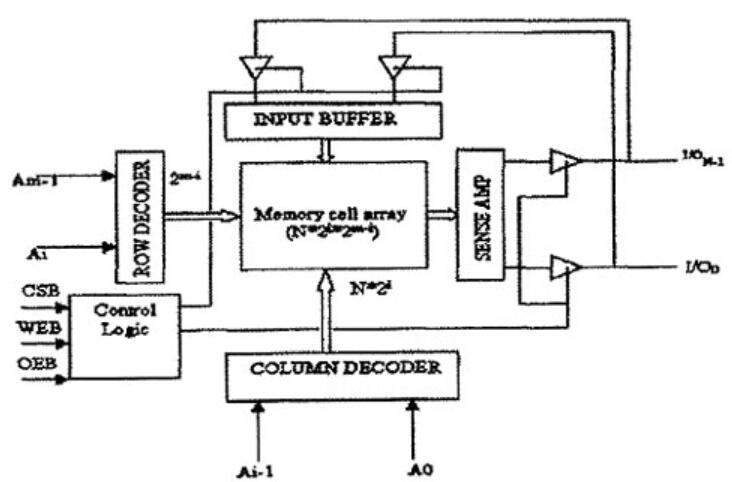 由上圖看出SRAM一般由五大部分組成,即存儲單元陣列、地址譯碼器(包括行譯碼器和列譯碼器)、靈敏放火器、控制電路和緩沖/驅(qū)動電路。在圖中A0-Am-1為地址輸入端,CSB. WEB和OEB為控制端,控制讀寫操作,為低電平有效1100-11ON-1為數(shù)據(jù)輸入輸出端。存儲陣列中的每個(gè)存儲單元都與其它單元在行和列上共享電學(xué)連接,其中水平方向的連線稱為“字線”,而垂直方向的數(shù)據(jù)流入和流出存儲單元的連線稱為“位線”。