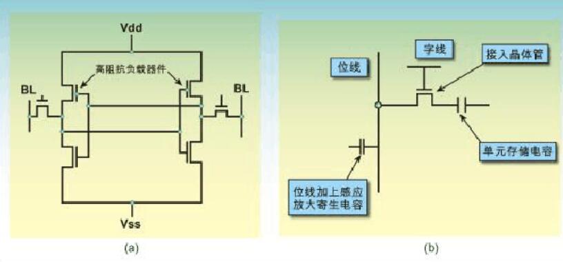 圖1a:典型的六晶體管靜態(tài)RAM存儲單元。圖1b:典型的單晶體管/單電容動(dòng)態(tài)存儲器存儲單元。