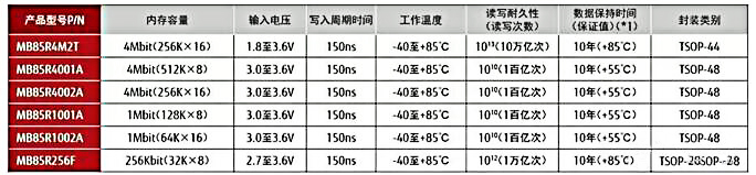 并行接口存儲器為采用TSOP或SOP封裝的256Kbit至4Mbit的產(chǎn)品,工作時的電源電壓為3.3V,但MB85R4M2T能夠在1.8V-3.6V的大范圍內(nèi)進行工作。封裝方式為能夠與SRAM兼容的TSOP或SOP。