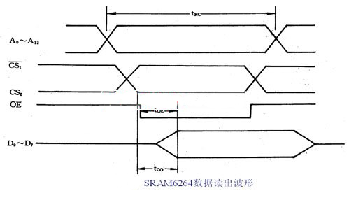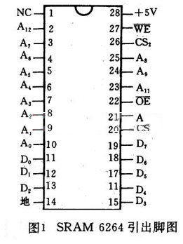 (1) 8K×8bit的CMOSRAM芯片 ① 引線功能。6264(6164)有28條引出線,它們包括:A0~A12為13條地址信號(hào)線。D0~D7為8條雙向數(shù)據(jù)線。CS2為兩條選片信號(hào)的引線。