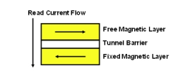存儲位的置“0”狀態(tài)或置“1”狀態(tài)正是由自由層的極性來確定的。自由層極性和固定層極性一致時(指向相同方向),穿越MTJ棧層的阻抗很低(請參閱圖1)。自由層極性和固定層極性180度相反時(指向相反方向),穿越MTJ棧層的阻抗就很高(請參閱圖2)。由MTJ堆棧中的低阻抗和高阻抗來確定是否將位元讀為“0”或“1”。