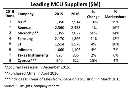 由于瑞薩、三星以及意法半導(dǎo)體等廠商未發(fā)起行業(yè)并購,所以2016年微控制器業(yè)務(wù)營收僅有小幅成長,有些甚至還出現(xiàn)下跌。譬如,三星去年MCU業(yè)務(wù)就出現(xiàn)大幅跌落,是前8大MCU廠商唯一下滑超過10%的廠商。