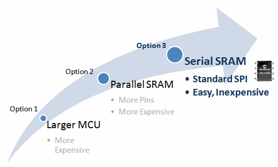 3. 串行SRAM現(xiàn)在支持向設(shè)計(jì)中靈活添加RAM,而不會(huì)帶來大型單片機(jī)或并行RAM的缺點(diǎn),它使用簡單的4引腳SPI接口。 SDI和SQI接口可將數(shù)據(jù)速率提高4倍,這些器件還會(huì)通過這兩個(gè)接口來提升性能。