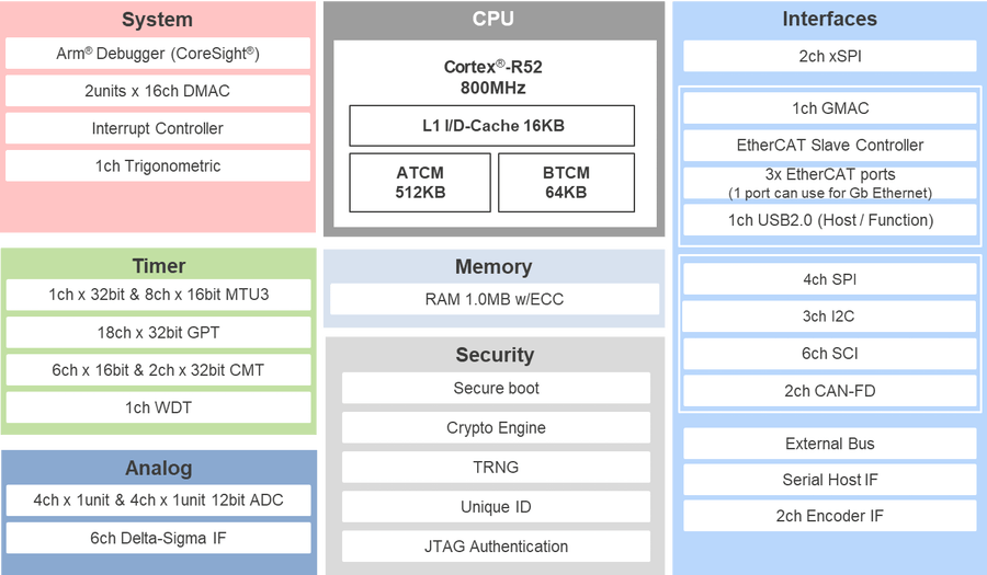 RZ/T2L is high-performance MPU that realizes high-speed and high-precision real-time control with EtherCAT. RZ/T2L has Arm® Cortex®-R52 @Max Frequency 800MHz and the large tightly coupled memory size (576 KB) is directly connected to the CPU, reducing the fluctuation in execution time that can occur when cache memory is used, and delivering deterministic and fast-response processing. RZ/T2L has seamless hardware architecture with RZ/T2M such as CPU core, peripheral functions and LLPP (Low Latency Peripheral Port) bus, and can be proposed for higher performance control systems such as AC servo. Also, RZ/T2L offers a scalable and compatible software platform with Renesas MPUs and MCUs. It enables customer utilizing their software assets for new model development.